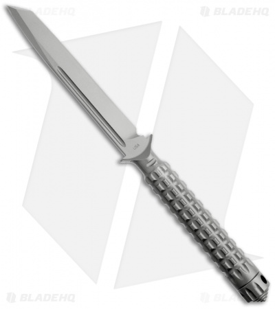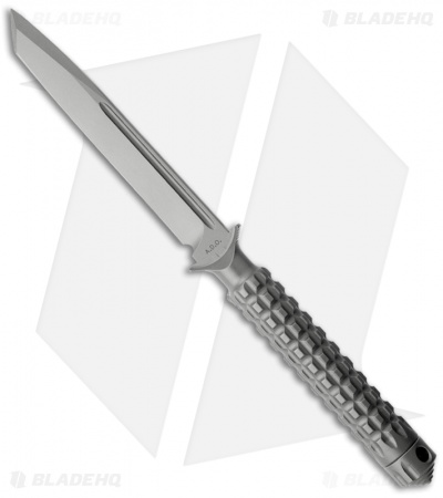 The A.D.O. (Alpha Detachment Operative) is an extraordinary fixed blade knife from Microtech. This ADO features a bead blast finished tanto blade (plain) with a partly sharpened swedge spine (less than 1/4″ at the tip). The handle with a waffle-style texture and features a Chris Reeve style hollow handle, accessed by unscrewing the glass breaker tip. It is made from a solid billet of stainless steel. The A.D.O. includes a composite sheath with a spring loaded tab to secure knife and a 2″ steel clip for belt carry.