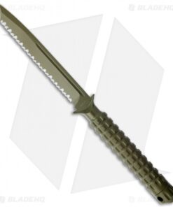 The A.D.O. (Alpha Detachment Operative) is an extraordinary fixed blade knife from Microtech. This ADO features a green finished tanto blade (fully serrated) with a partly sharpened swedge spine (less than 1/4″ at the tip). The handle with a waffle-style texture and features a Chris Reeve style hollow handle, accessed by unscrewing the glass breaker tip. It is made from a solid billet of stainless steel. The A.D.O. includes a composite sheath with a spring loaded tab to secure knife and a 2″ steel clip for belt carry.