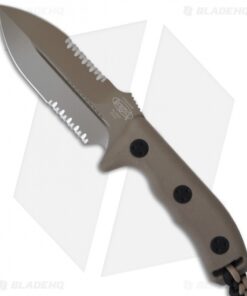 The Microtech Crosshair fixed blade knife in tan is tried and true; this knife will hold up to the most adverse conditions. The tan finished blade is full tang and double-edged with partial serrations. The handle has composite scales and a braided lanyard with a stainless steel “knocker” bead. Includes a heavy duty Kydex sheath with locks.