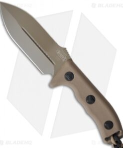 The Microtech Crosshair is an extremely sturdy fixed blade knife. This knife is tried and true; it will hold up to some adverse conditions. The D2 blade is full tang, tan colored, and double edged. The edges are standard plain. The handle is a tan polymer with a braided lanyard and stainless steel “knocker” bead. Includes a heavy duty Kydex sheath.