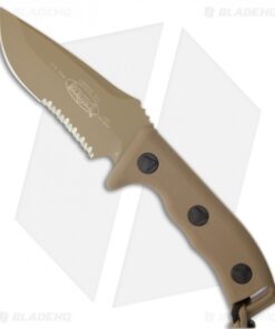 Microtech’s Currahee knife is built like a tank. It has a full-tang Elmax steel drop point blade with a partially serrated edge and tan finish. The coyote composite polymer handle is outfitted with a lanyard and knocker bead. Includes heavy duty sheath with MOLLE locks.