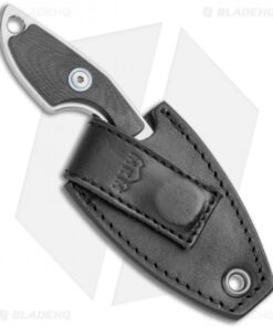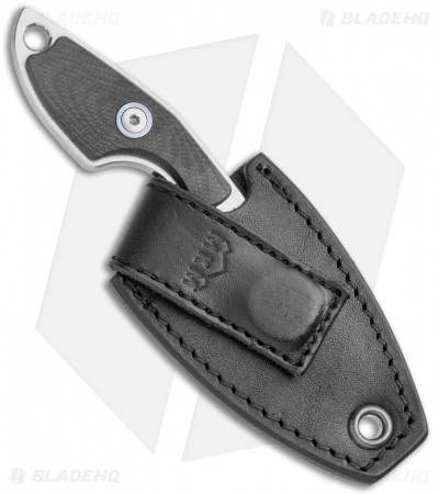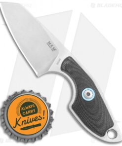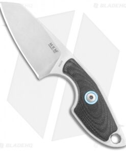 This MKM Mikro 2 fixed blade model was designed by legendary Danish knife maker Jesper Voxnaes, and is rocking a stonewashed Bohler M390, sheepsfoot blade and black G-10 handle scales with satin hardware and a blue collar. This compact blade comes with a leather sheath and neck band to be used as a neck knife.