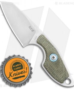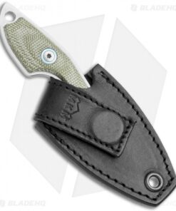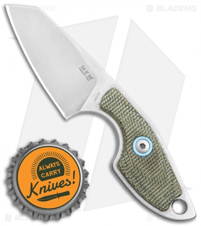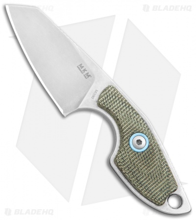 This MKM Mikro 2 fixed blade model was designed by legendary Danish knife maker Jesper Voxnaes, and is rocking a stonewashed Bohler M390, sheepsfoot blade and green micarta handle scales with satin hardware and a collar. This compact blade comes with a leather sheath and neck band to be used as a neck knife.