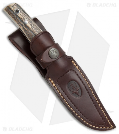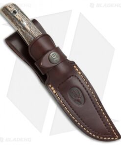 The Muela Eagle is a full-tang fixed blade with a traditional design. It features a stainless steel clip point blade with a satin finish and a full flat grind for clean, easy slicing. Genuine stag handle scales and a polished nickel silver bolster offer a classic look and a comfortable grip. The Eagle includes a durable brown leather belt sheath for convenient carry and storage.