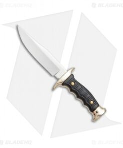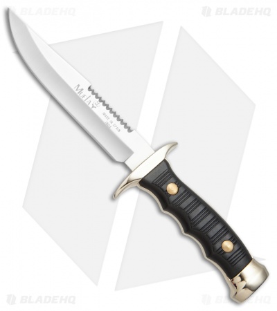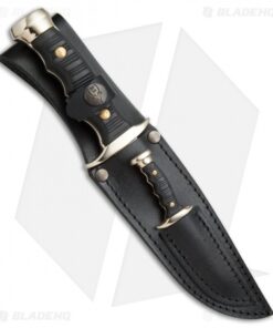 This Muela Piggyback Set combines a fully functional fixed blade with a smaller novelty knife. The larger knife features a satin finished stainless steel blade with a partial sawback. It has a brass handle with grooved polymer scales for added traction in hand. The mini fixed blade is made from the same materials, but in a smaller package. Both knives can be carried comfortably and securely in a black leather belt sheath.