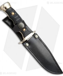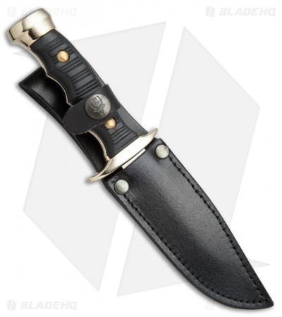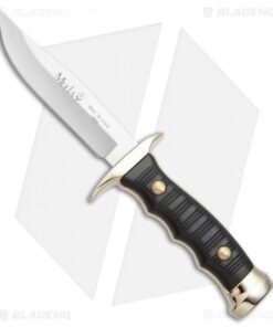 The Muela Premium Bowie features a stainless steel clip point blade with a satin finish and a plain edge. Its grooved handle scales provide added traction for a firm grip during use. The Premium Bowie fixed blade makes a great collector’s item, or everyday utility knife. This model has a brass handle with black Kraton scales. Includes a black leather belt sheath for secure carry.