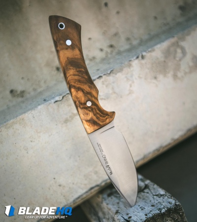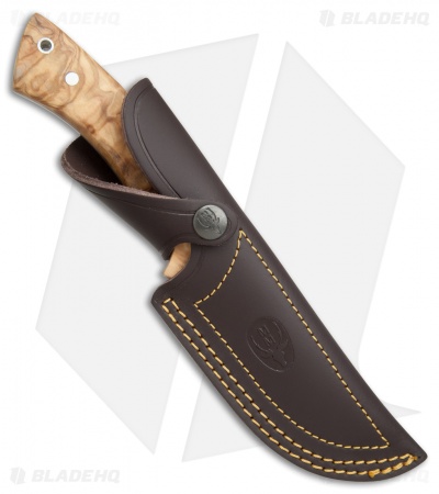 The Muela Rhino is a fine-tuned, wide bellied fixed blade with an affinity for hunting and general purpose tasks alike. It features a versatile stainless steel drop point blade with steadfast, full-tang construction. Fine olive wood handle scales with a deep finger choil ensure a comfortable, firm grip during use. This model has smooth olive wood handle scales and a satin blade finish. Includes a brown leather sheath for secure belt carry.