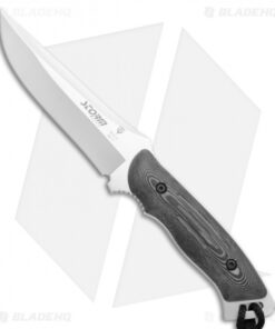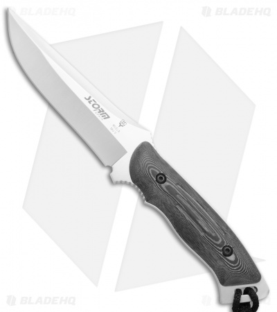 The Storm fixed blade by Muela Knives offers solid full-tang construction and a sleek ergonomic design. Its blade is made from tough Moly-Vanadium stainless steel with a satin finish and a keen cutting edge. Rounded black Micarta handle scales, combined with jimping on the thumb ramp and choil, provide top notch grip security and comfort during use. Includes a black leather belt sheath.