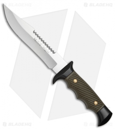 This Muela Survival fixed blade is armed with a satin finished, stainless steel recurve bowie blade with a hollow grind and a partial sawback. Its handle is built from sturdy black coated stainless steel with grooved OD green polymer scales for added grip security. The knife is comfortably carried with the included black polypropylene belt sheath.