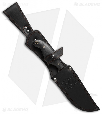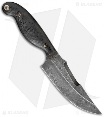This Baikal knife is outfitted with contoured carbon fiber scales with white liners and fastened with mosaic pins. Its Persian blade is HCVD Damascus steel with a slick and stylish double offset false edge. Premium leather sheath included.