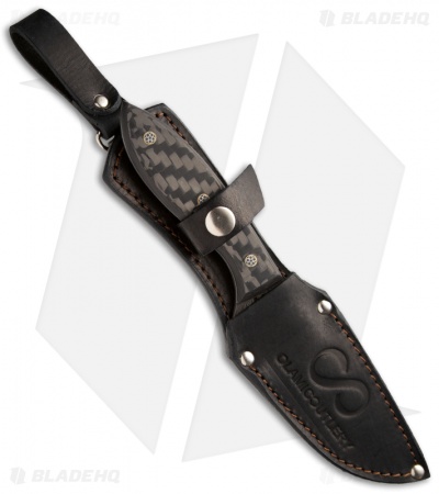 This 5″ Persian knife from Olamic Cutlery is stellar. It has a high carbon vanadium Damascus steel full-tang blade with carbon fiber scales. Includes a premium leather sheath.