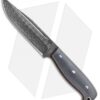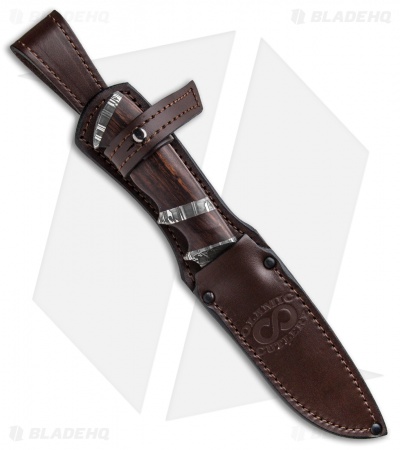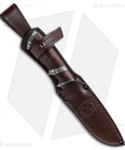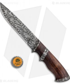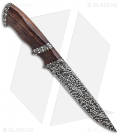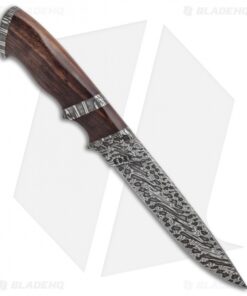 This Suna fixed blade from Olamic Cutlery features a Nickel Carbon Mosaic Damascus steel blade, bolster, and pommel. It has a rounded desert ironwood handle that comes equipped with a leather sheath.
