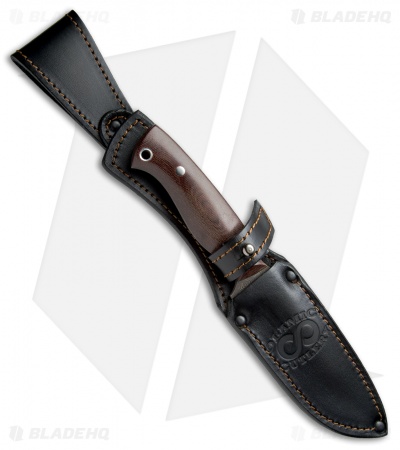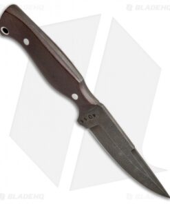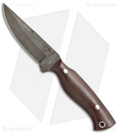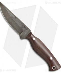 This Voykar Compact fixed blade knife from Olamic Cutlery has a high carbon vanadium Damascus steel blade and a maroon linen Micarta handle. The Voykar Compact includes a premium leather sheath.