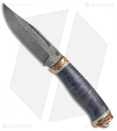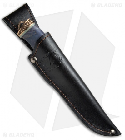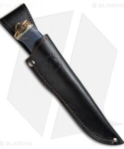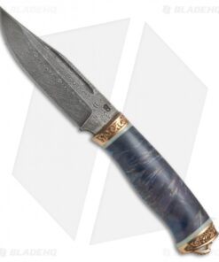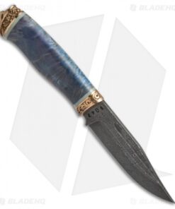 The Voykar HT4 is a masterfully crafted fixed blade knife that features a Karelian Birch handle with detailed bronze bolsters and moonglow G-10 inserts. The clip point blade is HCVD Damascus steel with a fuller and small index choil cutout. The Voykar HT4 fixed blade comes with a premium black leather sheath.