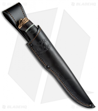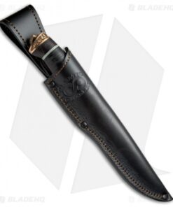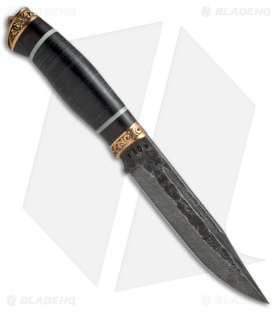 The Voykar HT4 is a masterfully crafted fixed blade knife that features a stacked leather handle with detailed bronze bolsters and moonglow G-10 inserts. The clip point blade is HCVD Damascus steel with a fuller and small index choil cutout. The Voykar HT4 fixed blade comes with a premium black leather sheath.