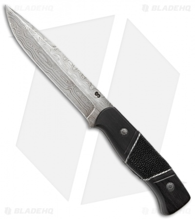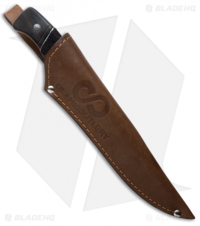The Voynik Elite is rich with detail and distinction. The handle is comprised of ebony wood scales, rayskin inserts and a silver plated rope trim. It has a full-tang HCVD Damascus steel drop point blade with an unsharpened swedge. The Voynik Elite fixed blade comes with a premium leather sheath.