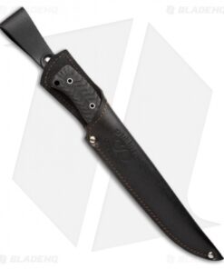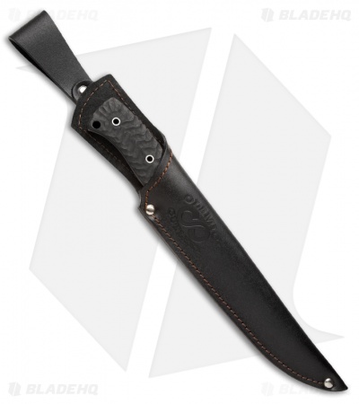 The Voynik knife is an impressive handcrafted fixed blade. This model has a relatively thin textured carbon fiber handle that provides intriguing visual depth. The blade is is HCVD Damascus steel with an unsharpened swedge. The Voynik fixed blade comes with a premium leather sheath.