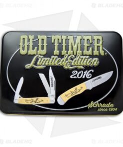 This limited edition 2016 gift set celebrates Schrade’s Old Timer line as one of their most well known brands. The gift set includes a fixed blade skinner and a traditional Blazer slip joint pocket knife with yellow handles and white tail deer scrimshaw. These knives come in a collectible 2016 Limited Edition tin. Includes a nylon sheath for the fixed blade.