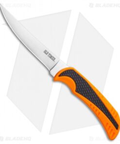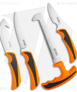 The Blaze 4-Piece Hunting Kit from Old Timer includes four outdoor tools for your next hunting trip: A filet knife, a fixed blade knife, a guthook fixed blade knife, and a hand saw. Each is made with a durable stainless steel blade and blaze orange plastic handles with black rubber inserts. The kit comes in a hard plastic case with a handle for easy transportation.