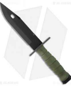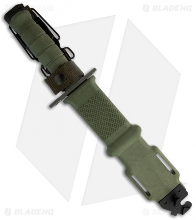 The 490 M9 Bayonet from Ontario OKC is part of their Military Issued line of knives. It has a black oxide coated 420 stainless steel blade with serrated saw back spine. Steel guard and pommel with molded OD green handle that is textured for grip. This knife comes with a snug fitting molded plastic sheath. Fit M16, M4 & AR-15 firearms.