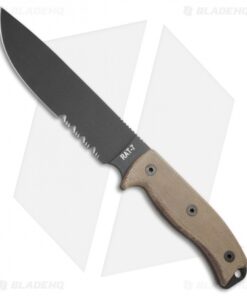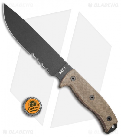 This RAT-7 model has black blade with a partially serrated edge and a micarta handle.
