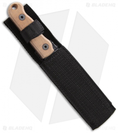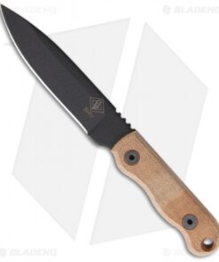 The Ranger Shiv fixed blade knife features a black texture powder coated 1095 steel blade with a plain edge. The full tang blade has thumb notching on the spine for a strong grip. This model features tan Micarta scales. Includes black nylon sheath.