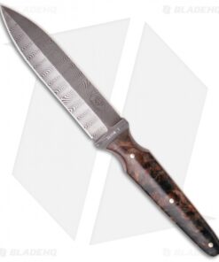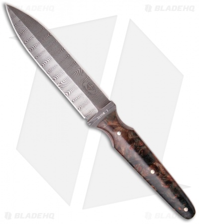 The Shadow Fighter DARK STAR from Paragon was made by master knife maker Eddie White. This fixed blade knife features Ladder pattern carbon Damascus 1520-1095V steel made by the cloisters. The burled Maple wood scales sit atop the full tang blade. The custom fitted leather sheath has a beautiful finish and includes a satin pocket clip. This is a gorgeous knife for those with discriminating taste.