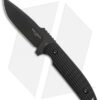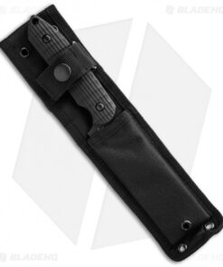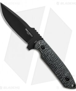 This Pro-Tech Rockeye fixed blade collaboration is an impressive adaptation of the custom Les George design. It has a black Cerakote finished steel blade; the front side of the blade bears the Pro-Tech logo, while the back side has the George cross. The handle is layered black/gray G-10 with a custom knurl-like texture.