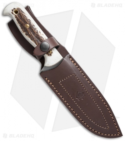 The Puma Iberico Hunter fixed blade features handmade quality and a traditional hunting knife design. It comes equipped with a full tang stainless steel blade in a clip point style with a satin finish. The handle is made from rustic stag horn and features a lanyard hole and a silver inlay of the Puma Knives logo. Brass pins and rivets add a beautiful finishing touch to the knife. The Iberico Hunter includes a brown leather belt sheath with a secure button snap.