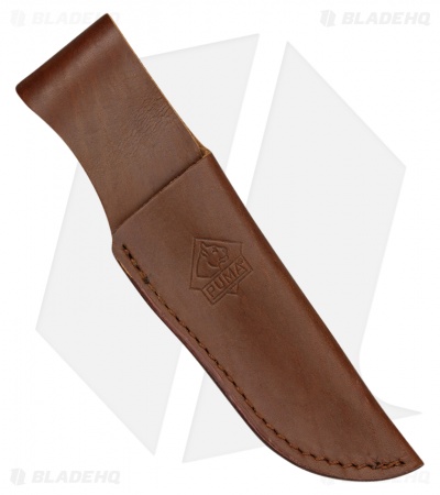 The wide drop point hollow ground blade made of German 1.4116 stainless steel, takes a fantastic edge and is an excellent slicer. Rounded stag handles are paired with nickel silver bolsters for a rustic look. A brown leather belt sheath allows for easy carry.