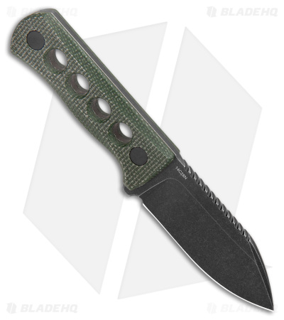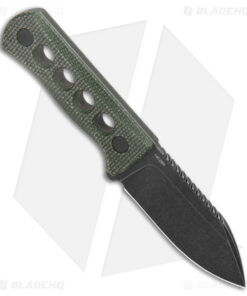 - Green micarta handle with four circular openings.