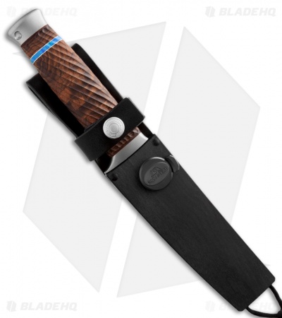 The DON-ZDP is a premium knife and the flagship fixed blade in the Rockstead lineup. It features a continuous convex surface on the VG-10 laminated ZDP-189 steel blade and carries a remarkable mirror finish. The handle is fluted Ironwood with silver and artificial opal embellishments. The guard and pommel are matte finished titanium. This is an exceptional knife and includes a leather and wood micarta sheath with switch lock to secure knife.
