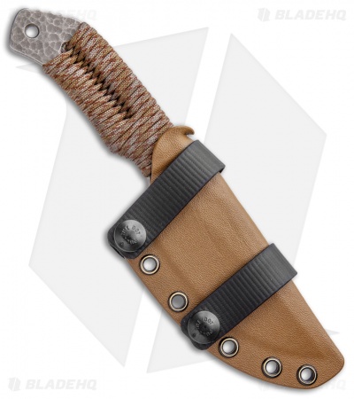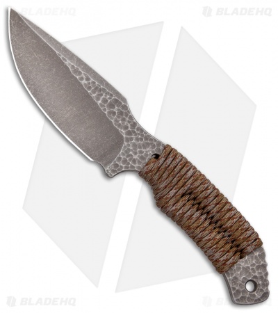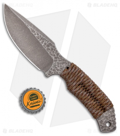 This model of the Rotten Design Drifter sports a drop point style blade with a hammered bronze stonewash finish and a brown camo paracord wrapped handle.