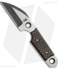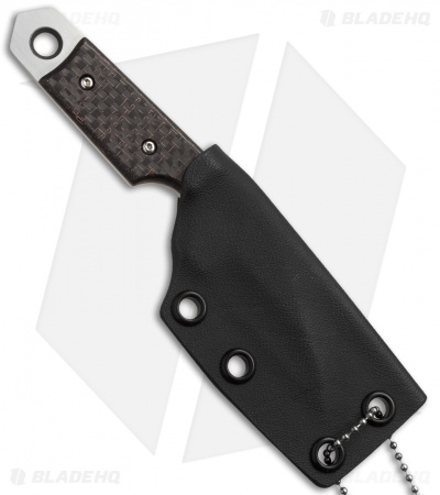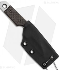 This Wharncliffe Dashi neck knife from Sam Eddleman is small, yet offers impressive control for a wide range of users. The Wharncliffe style blade is acid washed with satin flats and edged. It has hollow grinds with a single secondary grind on the front side of the blade. Lightning strike carbon fiber scales are rounded and smooth; it’s very clean and stylish. This knife comes with a Kydex sheath and ball chain for neck carry.