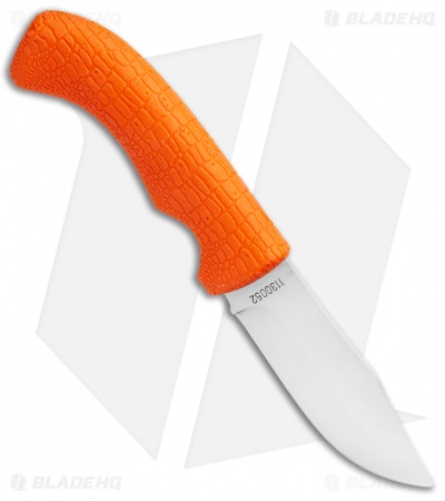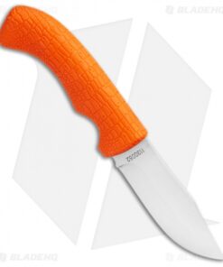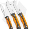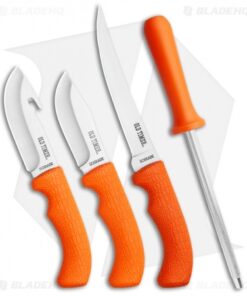 This Blaze knife set is great for hunting, fishing, and outdoor use. Includes a filet knife, a fixed blade knife, and a fixed blade knife with a guthook. Each is made with a durable stainless steel blade and blaze orange rubber handles. The pack comes with a single nylon sheath that houses all four tools.
