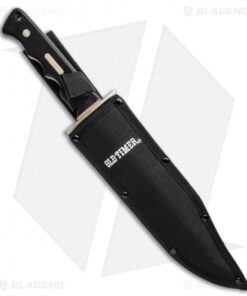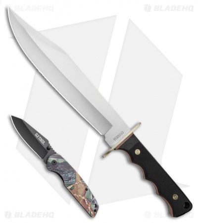 Meet the Schrade Old Timer Bowie Knife and Folder Combo. The Bowie Knife has a whopping 10″ satin blade with a deep clip point and hollow grind. The contoured handle is two-tone black and tan, built around a full tang with brass rivets and a brass cross guard. The item includes a black nylon belt sheath. The Old Timer Folder has a thumb stud for quick manual unmasking and a black 3″ drop point blade. It is a great pocket choice when you are on the move.