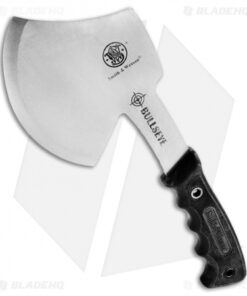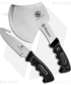 Axe measures 10 3/4″ overall. 440C stainless axe head with a 4 1/2″ cutting edge. Also includes a 9 1/4″ overall fixed blade hunter with a 4 1/2″ 440C stainless guthook blade. Both have a black rubber handle and store in a black cordura belt sheath.
