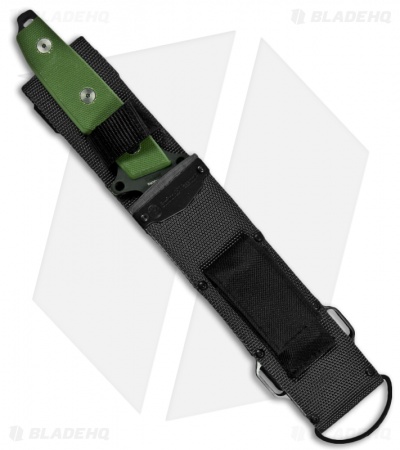 OD green handles. 13 3/4″ overall. 8 1/4″ black powder coated 440C stainless tanto blade. Full tang. G-10 handles with lanyard hole. Black heavy nylon belt sheath with hardshell liner and stone pocket. Weighs 17.5 oz.