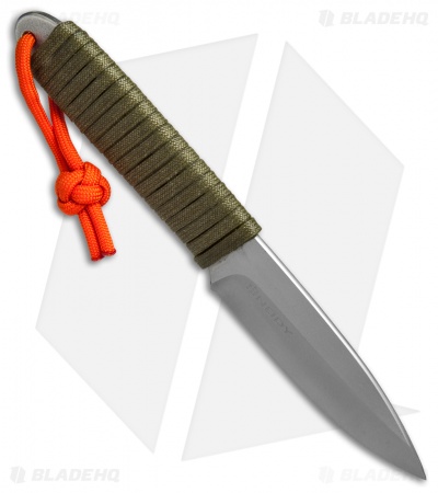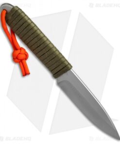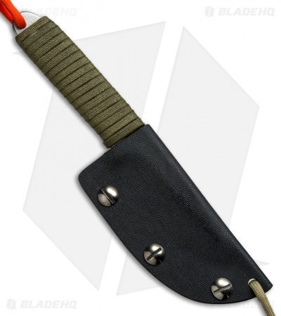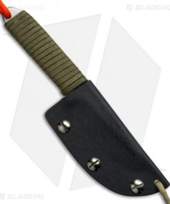 The Snody Boss fixed blade is made from solid CPM-S35VN stainless steel with a chisel ground blade and a gray finish. Its handle is wrapped in OD green paracord for added grip security. Includes a black Kydex belt sheath.