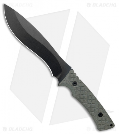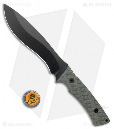 This Machai has a green micarta handle and a black coated blade.