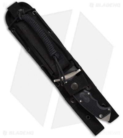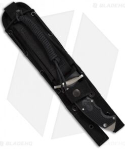 The Warrior combat knife from Spyderco features a rust-free H-1 steel blade with a hollow-ground plain cutting edge and serrated edge spine portion. The skeletonized full-tang handle features FRN Bi-Directional Textured scales. Includes a black ballistic nylon sheath with Molle-vest attachment capability.