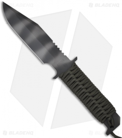 The CPM S30V clip point blade is multi-ground with a flat ground edge, razor sharp! The tiger stripe finish gives this knife a tactical, low profile look. The front tang is marked “STRIDER” and the back has the logo. Full tang construction makes this knife very solid. Handle is paracord wrapped (OD green) and features jimping on the blade spine for thumb. Includes heavy duty Eagle Brand Nylon sheath system with felt bonded Kydex liner & accessory pouch (big enough to hold a small folder, tool kit, fire starter, etc.).