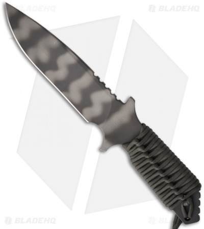 The CPM S30V steel blade with a flat ground, razor sharp edge! The tiger striped finish gives this knife a tactical, low profile look. The front tang is marked “STRIDER” and the back has the logo. Full tang construction makes this knife very solid. The handle is OD green cord wrapped and has jimping on the thumb ramp. Includes heavy duty Nylon sheath system from Eagle Brands.