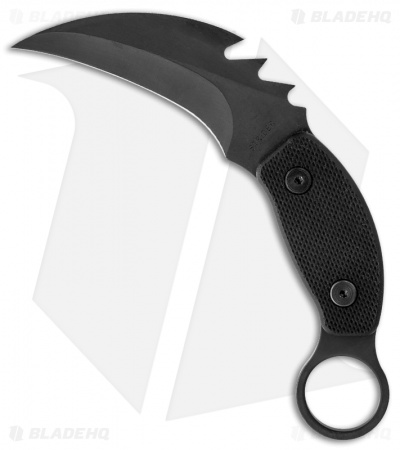 This Strider Karambit fixed blade has a CPM S30V steel blade with hollow ground razor sharp edges! The front tang is marked “STRIDER” and the back has the logo. Full tang construction with textured black G-10 scales. Includes a Kydex sheath with a heavy duty nylon belt loop.