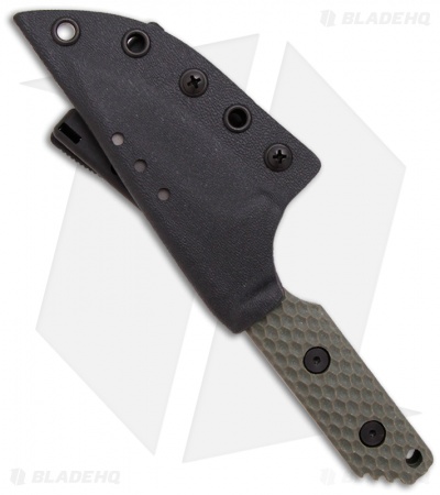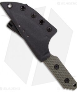 This SA fixed blade knife from Strider has a 3/16 inch thick S30V stainless steel spear point blade with a tiger stripe finish. The front tang is marked “STRIDER” and the back has their logo. Full tang construction makes this knife very solid. The handle is GG “Gunner Grip” green G-10 and features jimping on the thumb ramp. Includes a Kydex sheath.