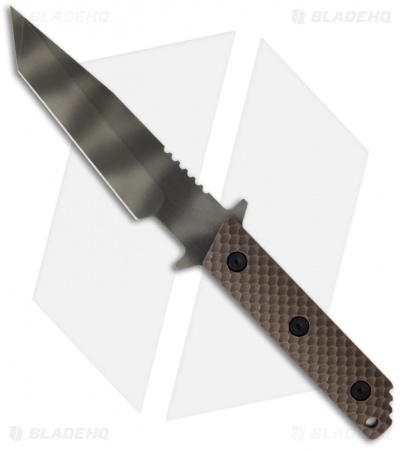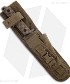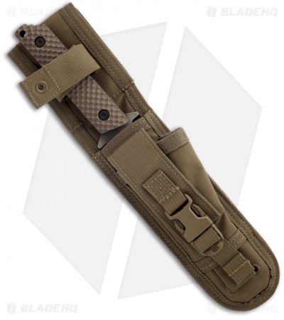 This WB MOD-10 fixed blade knife has a CPM-S30V steel tanto blade with a tiger stripe finsh and Brown Gunner Grip G-10 handles. The blade is multi-ground with a flat ground, razor sharp edge! The front tang is marked “STRIDER” along with the blade steel and the back has the Stider logo. Full tang construction makes this knife very solid. Includes heavy duty MOLLE compatible sheath system with accessory pouch (big enough to hold a small folder, tool kit, fire starter, etc).