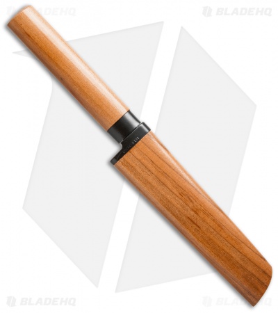 The Suncraft Kakugata fixed blade is a traditional Japanese kitchen knife. This knife is known for its sheepsfoot style tip and lightweight chopping blade. It is designed for chopping fruits and vegetables. The handle and sheath are made from a beautifully varnished wood that is contrasted with black accents and a satin finished steel blade. The Kakugata makes a wonderful kitchen knife or collectible item.
