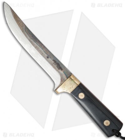 The Master Cutler Range of knives from Svord are dependable hunting knives for those who demand the best. The 870 knife is has a trailing point style high carbon steel blade with a two-tone finish: heat treated flats and satin grinds. The handle is polished black Micarta with a brass guard and rivets.
