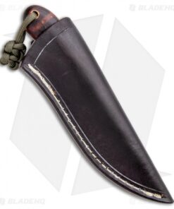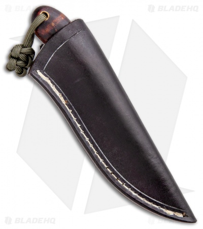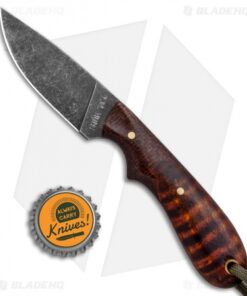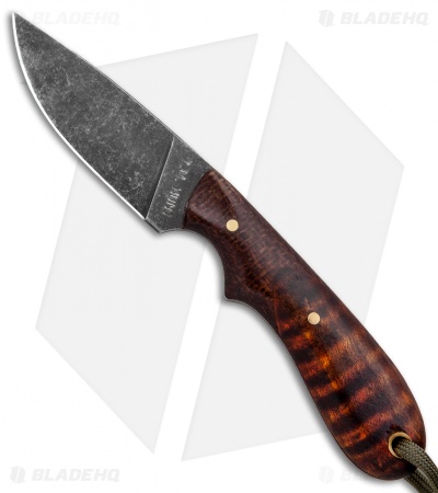 The T.M. Hunt Custom Hedgehog offers a stout, lightweight build that is ideal for daily cutting tasks and outdoor activities. It has a full tang drop point blade made from AEB-L stainless steel with a black acid washed finish. The smooth rounded handle is made from brown burlap micarta and curly maple. Item includes a custom leather belt sheath and an OD green paracord lanyard.