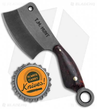 This “Leave it” Cleaver sports a black finished blade and a red dyed box elder burl handle.